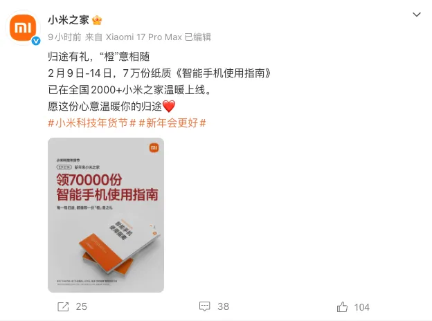 2 月 9 日消息,小米之家官方微博今日官宣推出橙意之礼:2 月 9 日-14 日,7 万份《智能手机使用指南》纸质版在全国 2000+ 小米之家上线。