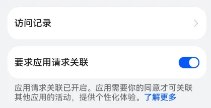 打开设置,搜「应用关联」,点进「跨应用关联」,再打开「访问记录」。
