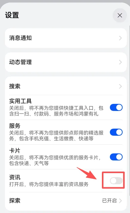 右滑到负一屏,点个人中心右上角的四个点→ 设置 → 关掉「资讯」。