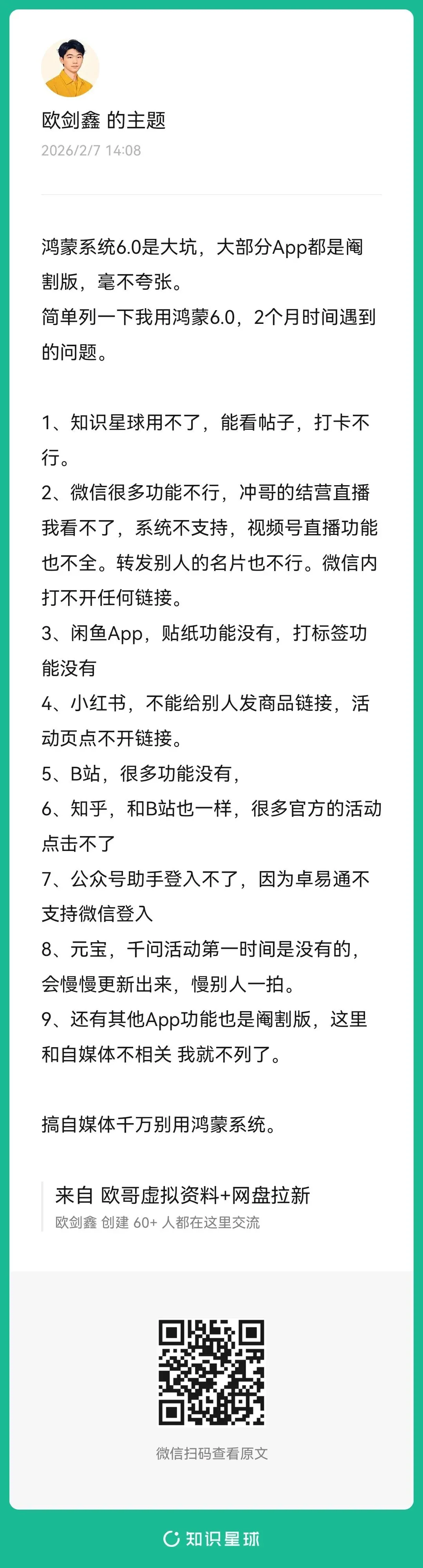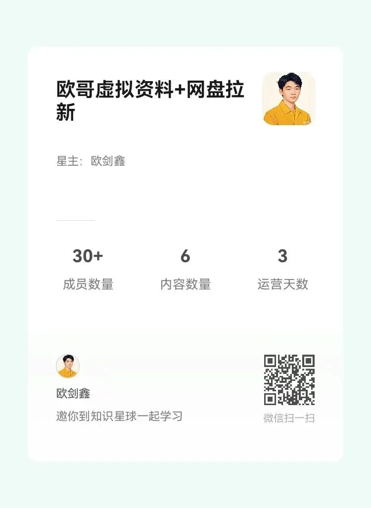 我创一个免费星球,分享自己做网盘拉新+虚拟资料+个人ip的经验,欢迎你加入与我一起交流。扫码即可加入