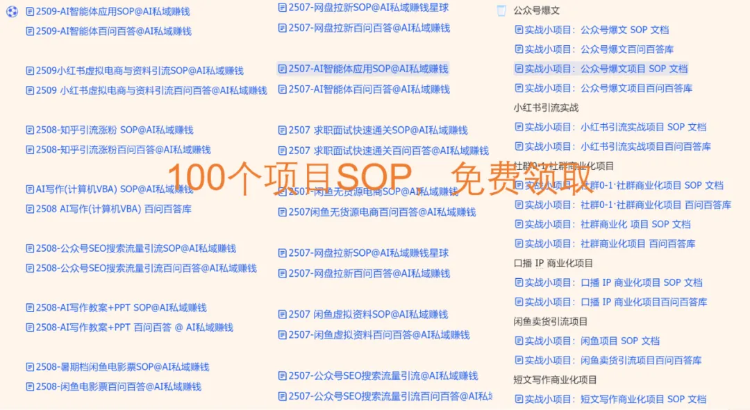 闲鱼虚拟资料,闲鱼无货源电商,网盘拉新,小红书资料引流,AI写作(教案、PPT、答辩、简历、数据分析、商业计划书等),AI编程商业化,公众号爆文,闲鱼电影票,知乎引流,AI绘画,AI智能体,私域CPS分销等等。