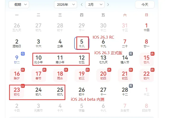 我们先结合 iOS 常规更新节奏分析:上周 iOS 26.3 RC 准正式版已推送,按照苹果惯例,本周有望发布 iOS 26.3 正式版。正式版推送后,iOS 26.4 beta 1 内测也会紧随其后,参考以往发布规律,本月底上线可能性极大。