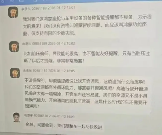 余承东在内部群里“开大”的聊天截图疯传,全网炸了锅。点名“鸿蒙智能座舱不配叫智能”,吐槽“胎压逻辑愚蠢、瞎提醒开窗通风”,火力拉满。更有意思的是,消息真伪未获官方确认,但用户对鸿蒙座舱的一些痛点反馈,却高度同频。这波不管是真是假,华为车机都被推到聚光灯下:要么迎来一场硬核升级,要么被对手在智能座舱这条赛道上追着打。