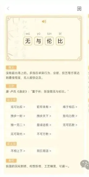 这款软件给人的第一感觉就是“清爽”。在这个到处是弹窗广告的时代,它坚持完全免费且界面极简,清新唯美的视觉设计让人在打开的那一刻,心情都会变得宁静。它不仅仅是一个冷冰冰的查询工具,更是一个集查询、学习、分类、收藏于一体的移动博物馆。无论你是想深度钻研成语背后的典故,还是想通过游戏消遣碎片时间,它都能精准满足。大家平时在写作或者表达时,会不会觉得词穷?这种“腹有诗书”的感觉,其实离我们并不远。