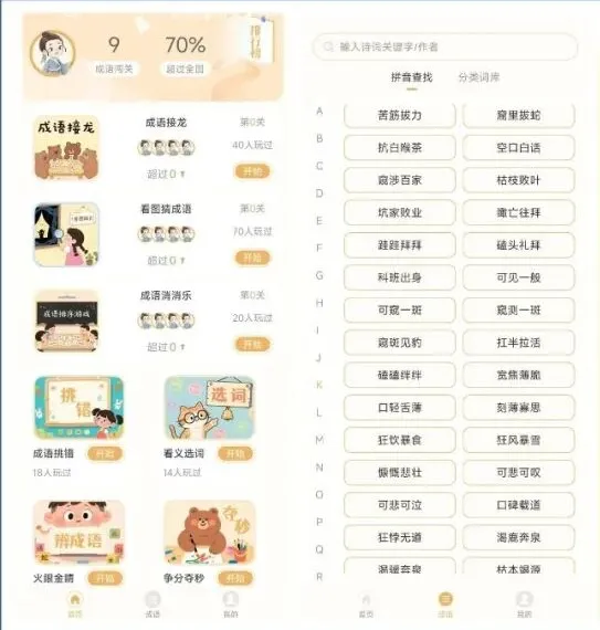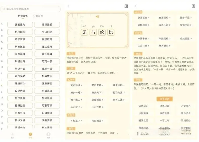 作为一款专业工具,它的“内功”极其深厚。软件收录了数万个成语,从日常高频使用的词汇到深奥冷僻的古语应有尽有。最让小哥觉得实用的是它精细的分类逻辑,你可以按照字数、构词方式甚至是具体的用法来检索。当你点开一个成语,它呈现的不仅是干巴巴的解释,还有拼音注释、真人点读、出处典故、例句应用以及近反义词。更精彩的是,它会为你解读成语背后的深度故事,让你明白这个词是怎么来的,该怎么用,这种全方位的“浸润式”学习,远比死记硬背要高效得多。