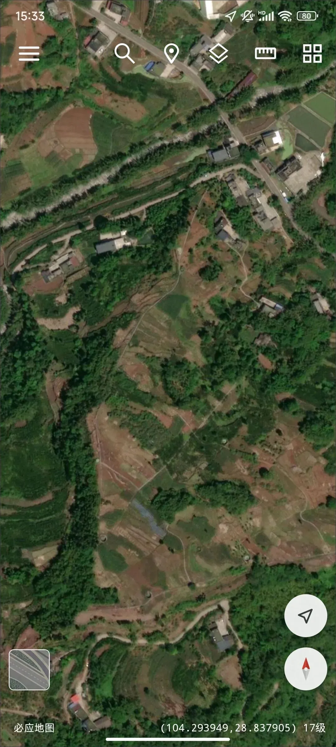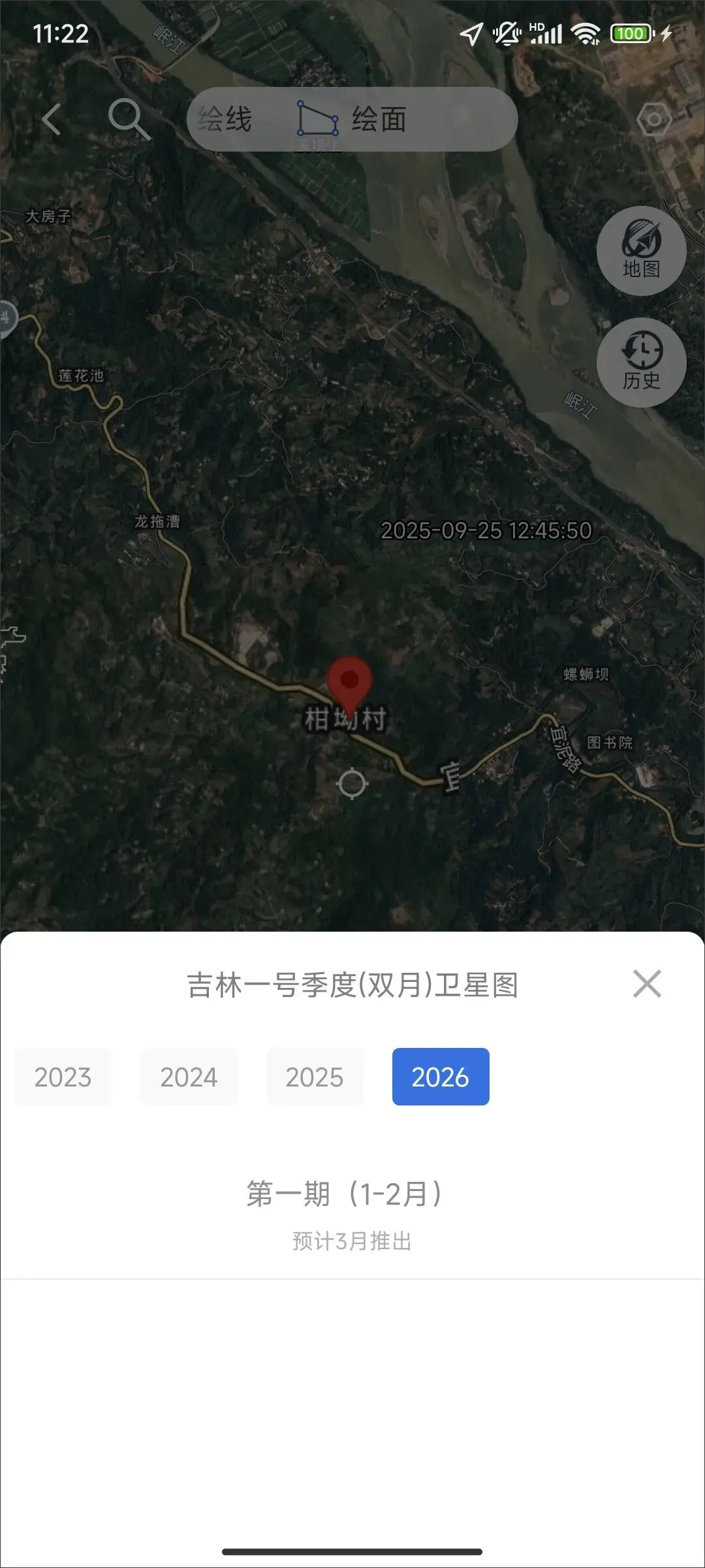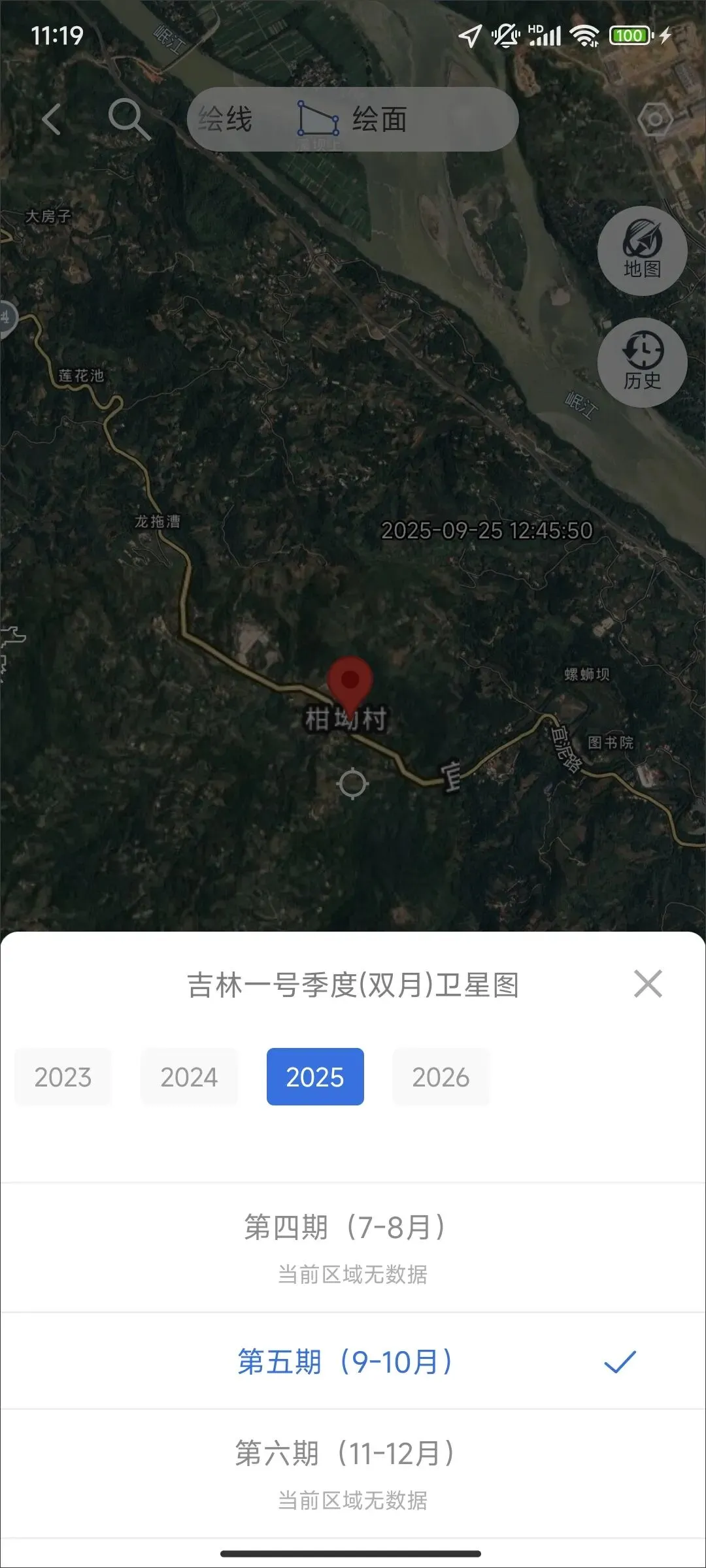 缩小地图显示,可以查看当前区域所能提供的最新的卫星影像,如下图所示区域所能提供的,是2025年9月25日所拍摄的卫星影像。