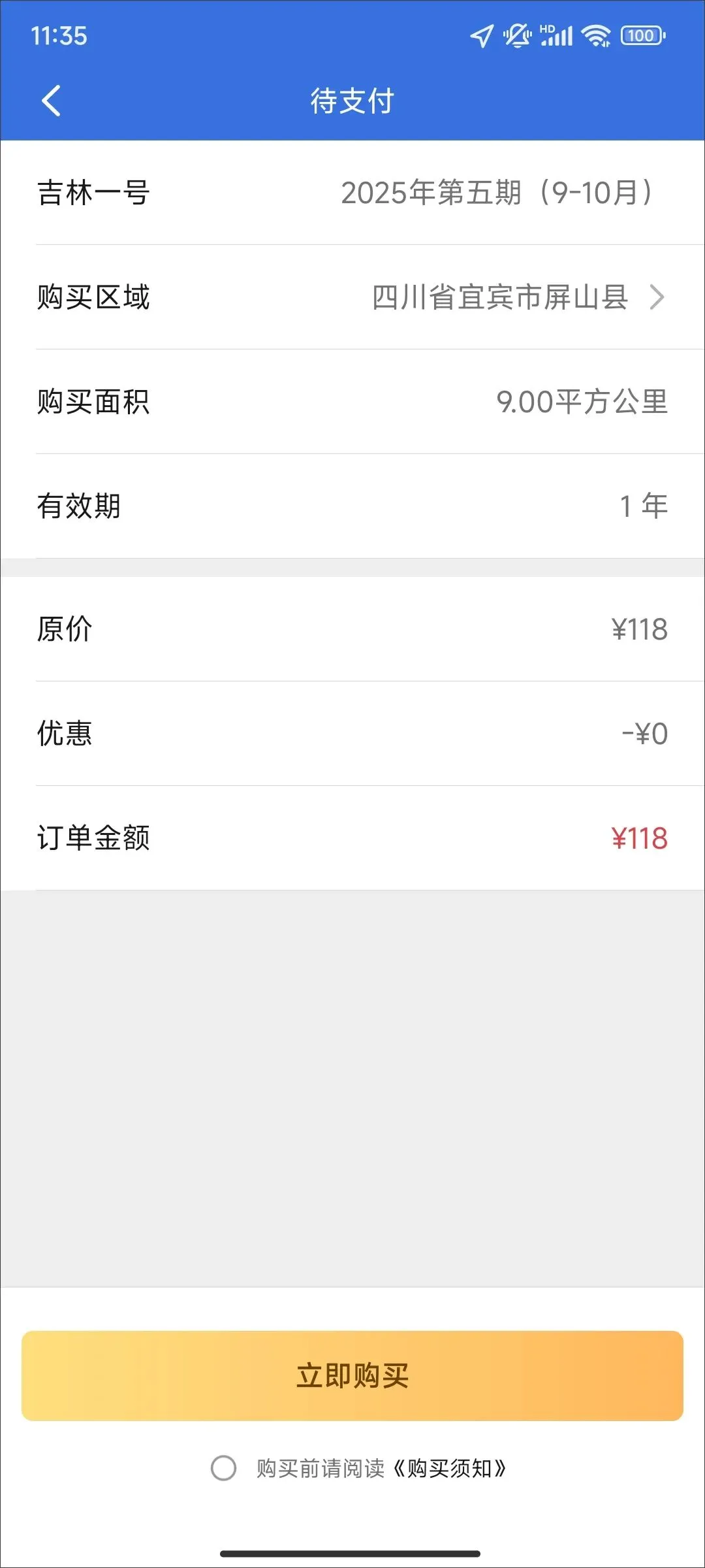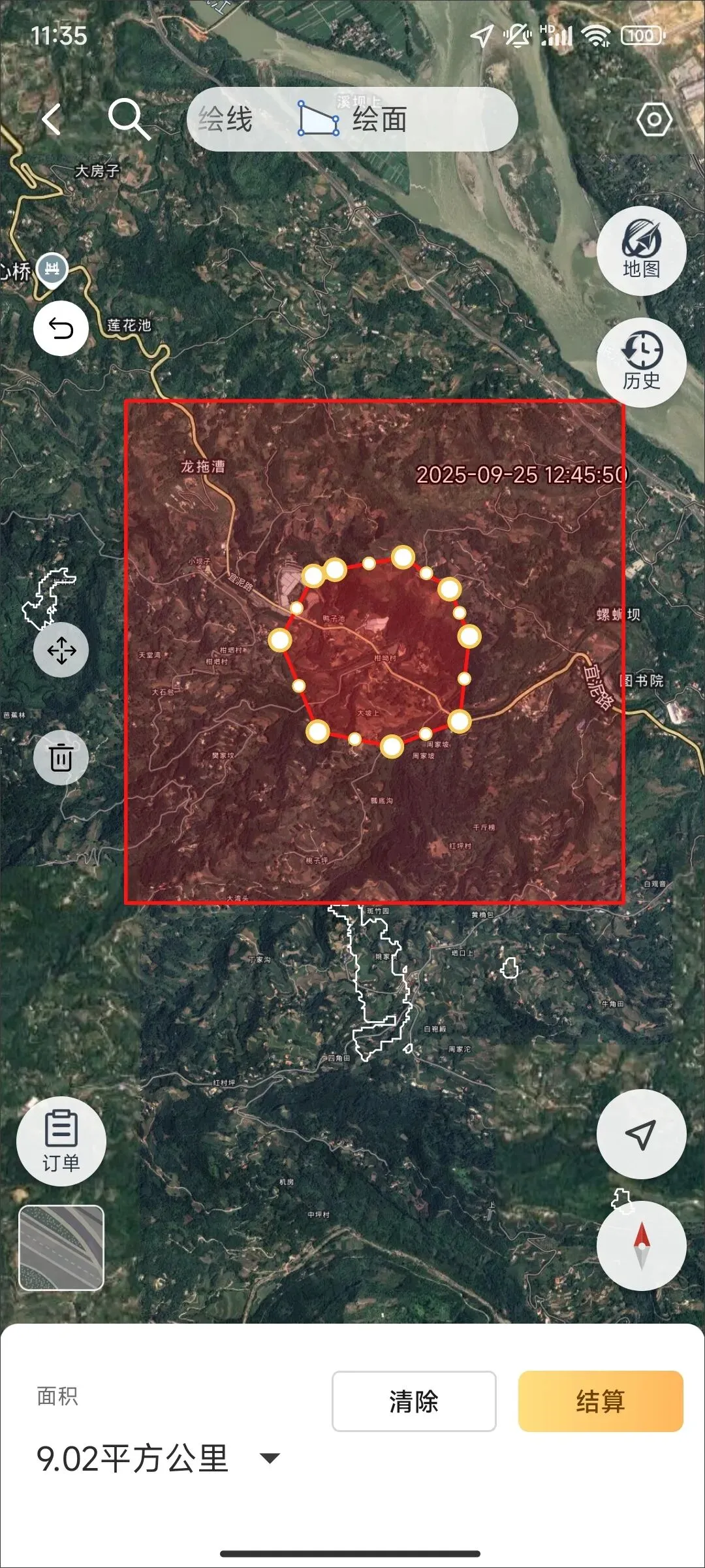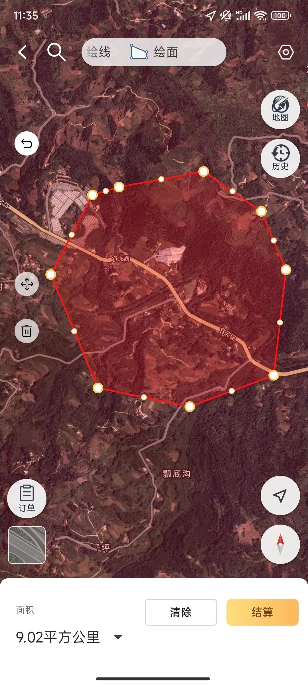 目标区域绘制完成之后,会自动返回所能提供的最终区域,将会按每9平方公里作为一个最小起售单位,确认无误后单击“结算”进入购买流程。