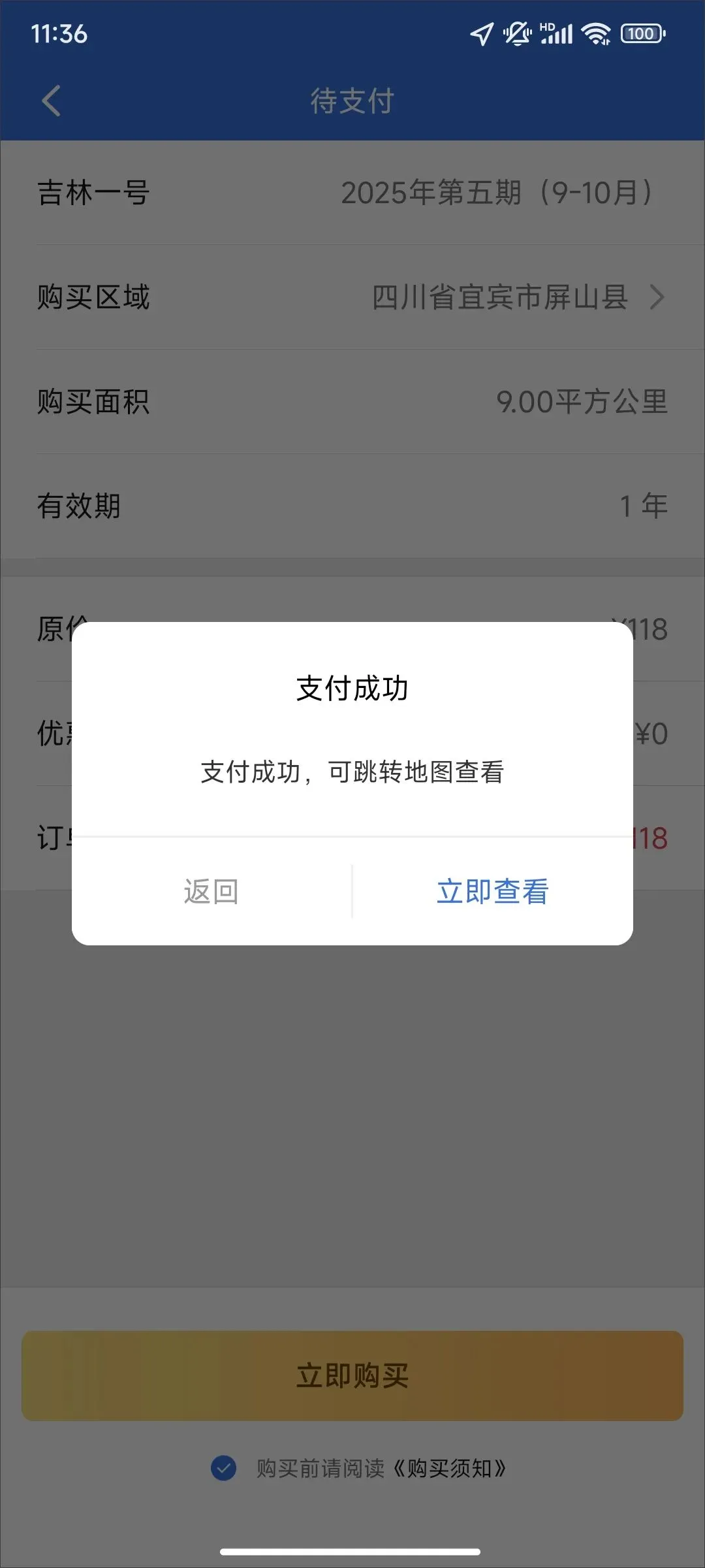 订单支付成功之后,可以单击“立即查看”会自动定位到目标位置,并显示你所购买的卫星影像。