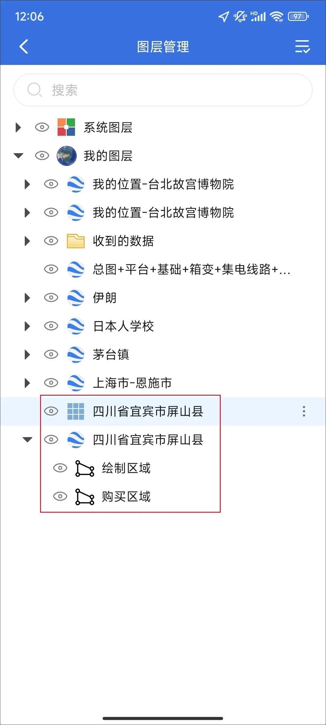 在图层树中,可以查看自动添加的卫星影像图层与你所绘制的购买区域等信息。