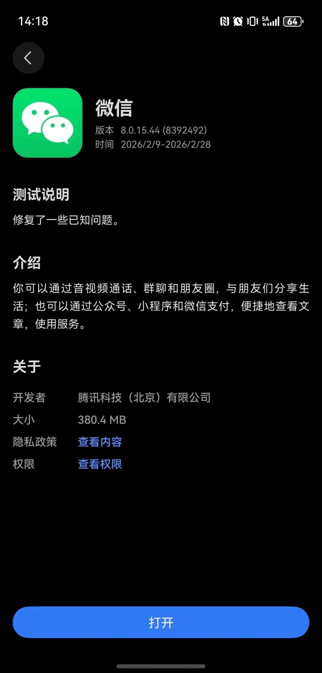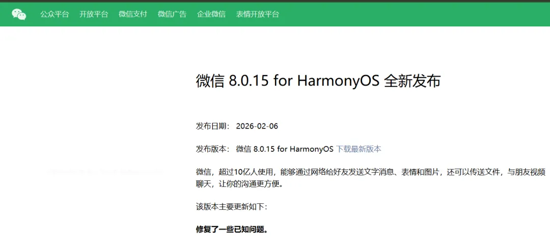 2026年2月6日,鸿蒙版微信迎来了最新版本,正式版8.0.15.38,对应测试版8.0.15.44,本次更新内容官方只说明“修复了一些已知问题。”。