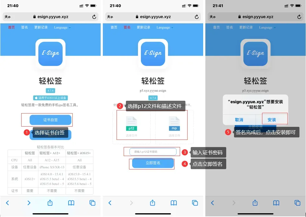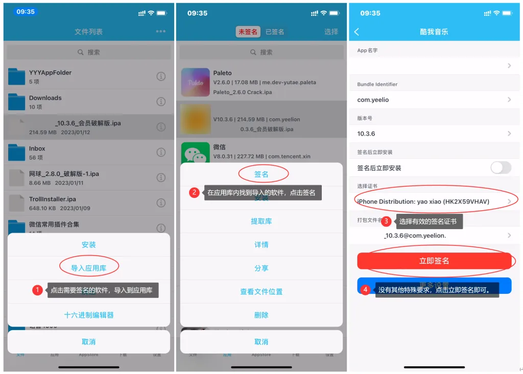 导入之后点击IPA软件,然后选择签名,选择有效的企业证书,然后按照步骤,点击安装即可。