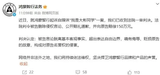 2月11日,鸿蒙智行法务官方账号发文称,起诉自媒体“我是大彬同学”一案,已收到法院一审判决,法院判令被告删除侵权言论、公开赔礼道歉,并向原告赔偿150万元。