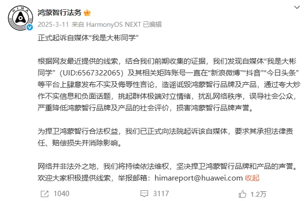 都市现场记者注意到,2025年3月11日,鸿蒙智行法务官方账号宣布正式起诉自媒体“我是大彬同学”,称根据网友线索和前期搜集证据,发现该自媒体及其相关矩阵账号发布不实及侮辱性言论,造谣诋毁鸿蒙智行品牌及产品。