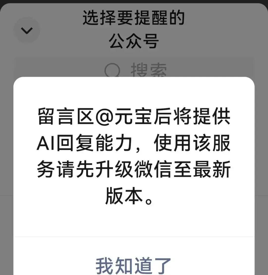 微信也变得奇奇怪怪。评论区@元宝怎么点都没反应,一直提示要升级,可我明明已经是最新版本了呀!