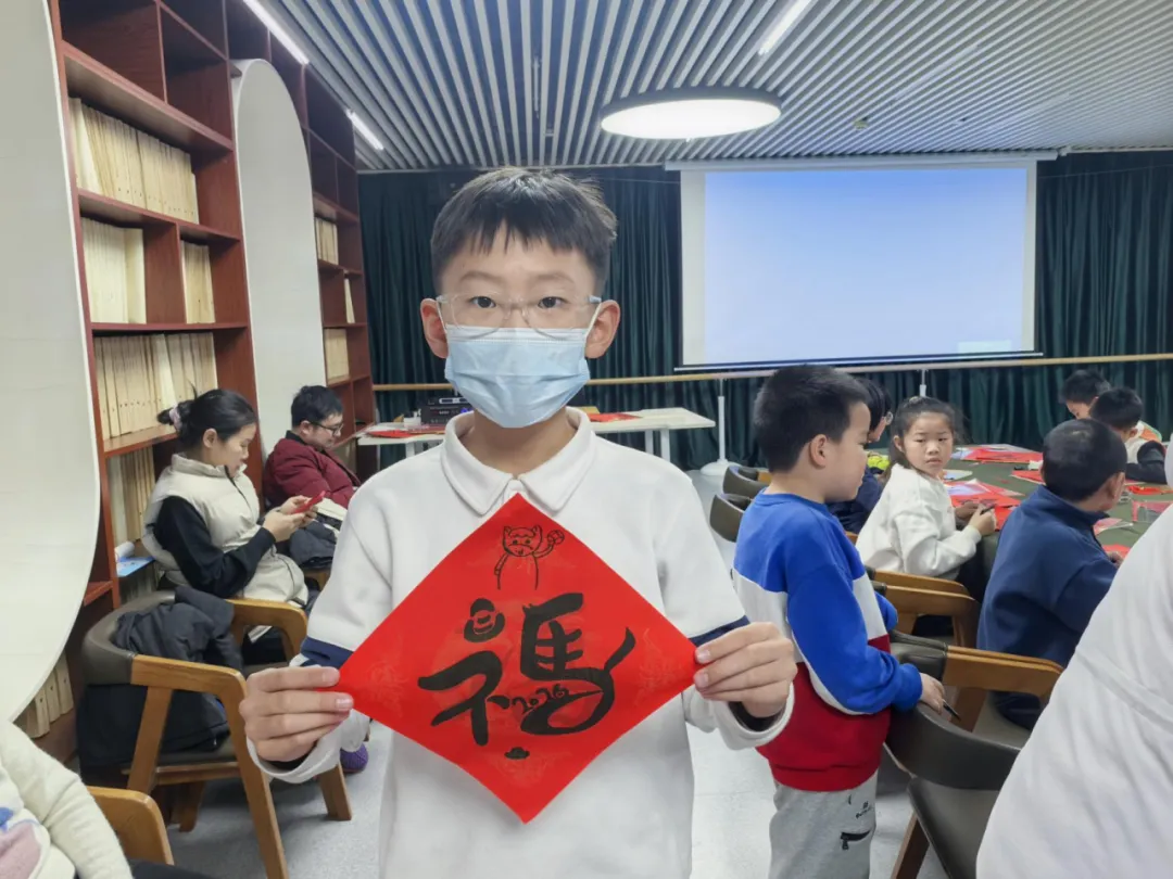 最令人期待的亲子 DIY 写福字环节将活动推向高潮。在美术菠萝老师的指导下,孩子们一笔一划地在红纸上描写 “福” 字。有的笔法稚嫩却饱含童真,有的工整规范尽显认真,大家相互展示成果,分享书写乐趣,一张张红彤彤的 “福” 字不仅承载着对新春的美好期盼,更定格了亲子互动的温馨瞬间。