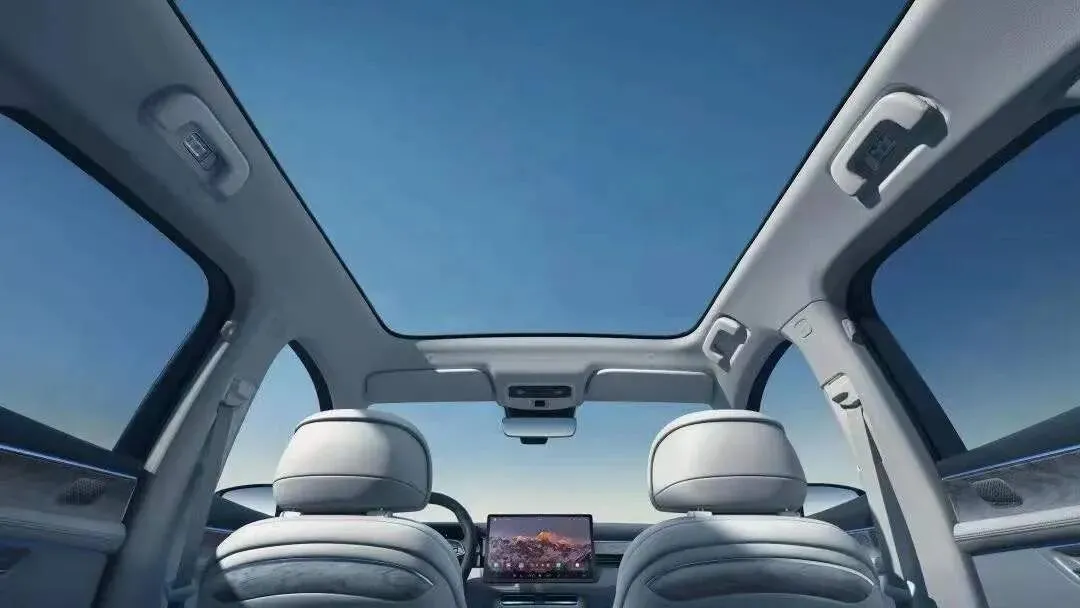 车舱顶部还配置了一块无缝全景天幕,天幕可以隔绝 99% 的紫外线,既可以享受到敞篷般的通透,又能保证你的皮肤不被阳光晒伤。
