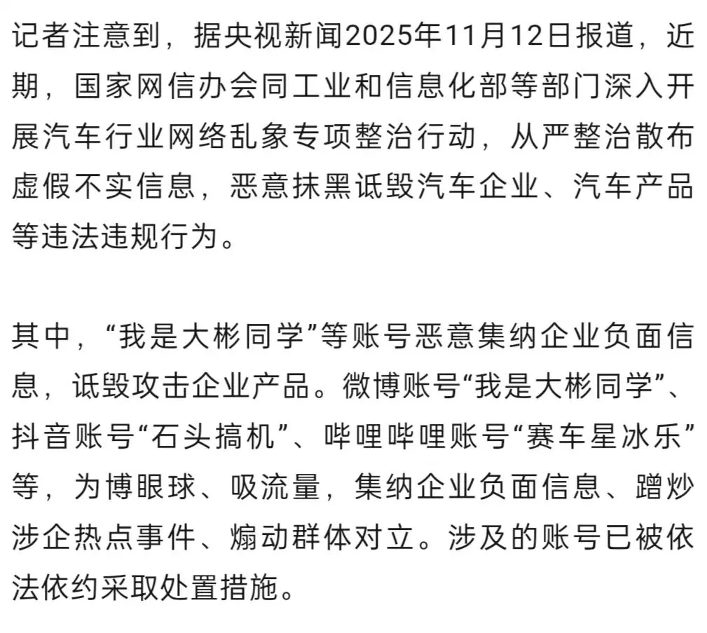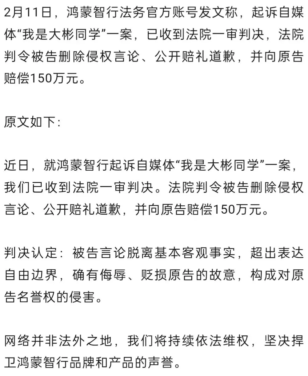 都市现场记者注意到,2025年3月11日,鸿蒙智行法务官方账号宣布正式起诉自媒体“我是大彬同学”,称根据网友线索和前期搜集证据,发现该自媒体及其相关矩阵账号发布不实及侮辱性言论,造谣诋毁鸿蒙智行品牌及产品。