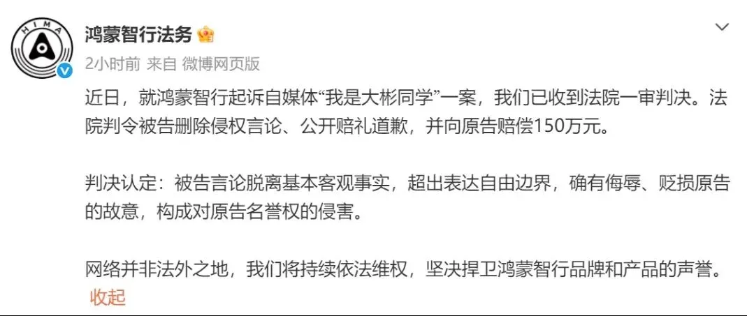 鸿蒙智行法务发布公告,已收到法院一审判决。