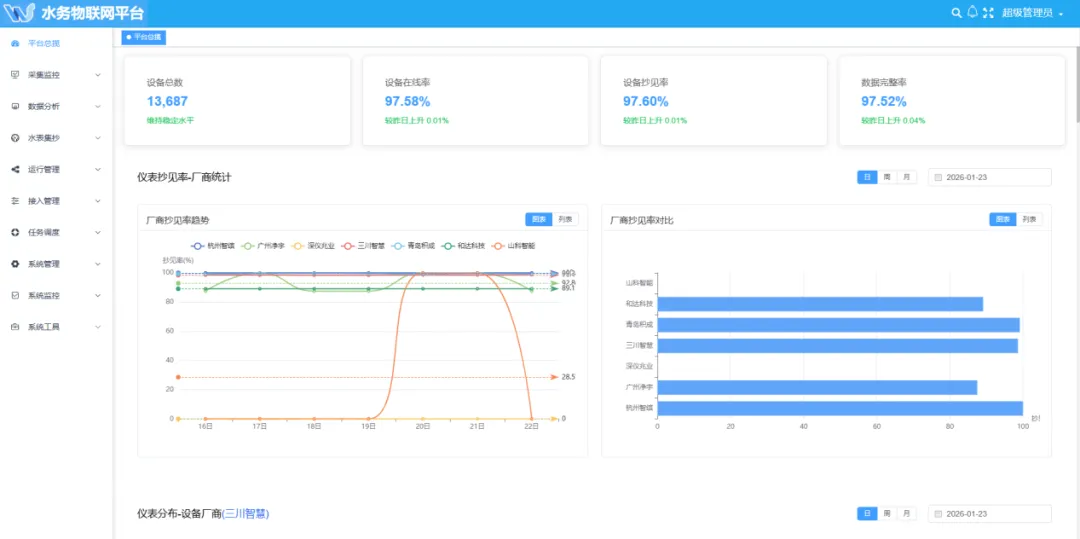 平台支持多协议多接口,可无缝连接水务场景中的水位、流量、渗压、渗流、大坝变形GNSS、水质、视频、水表、工情监测等各类设备,实现数据采集、远程控制与设备状态实时监控;具备高效的数据清洗、规则配置与跨库共享能力,保障数据精准一致;提供了灵活的数据共享选项,实现高效的数据传输与同步。同时兼具高可扩展性与定制化特性,灵活适配不同水务管理需求。