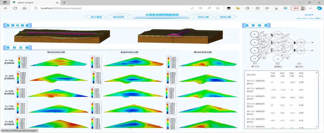 响应水利部矩阵建设“四预”、“智能大坝”要求,为大坝安全量身打造的智能化、全流程安全保障系统。系统聚焦大坝运行核心风险,实现“数据自动接入—模型联动计算—风险可视化预警”的业务闭环。系统融合传统统计模型、神经网络模型、有限元模型三大核心模型优势,提升复杂工况预测精度,实现多工况下坝体状态快速计算,协同形成立体监测网络。可精准识别水压、温度、时效、降雨等关键影响因子,揭示大坝运行演化规律,预测精度经实践验证,相关系数最高达0.96,有力提升了大坝安全管理的科学化、现代化水平,赋能城市洪涝防治智慧决策。