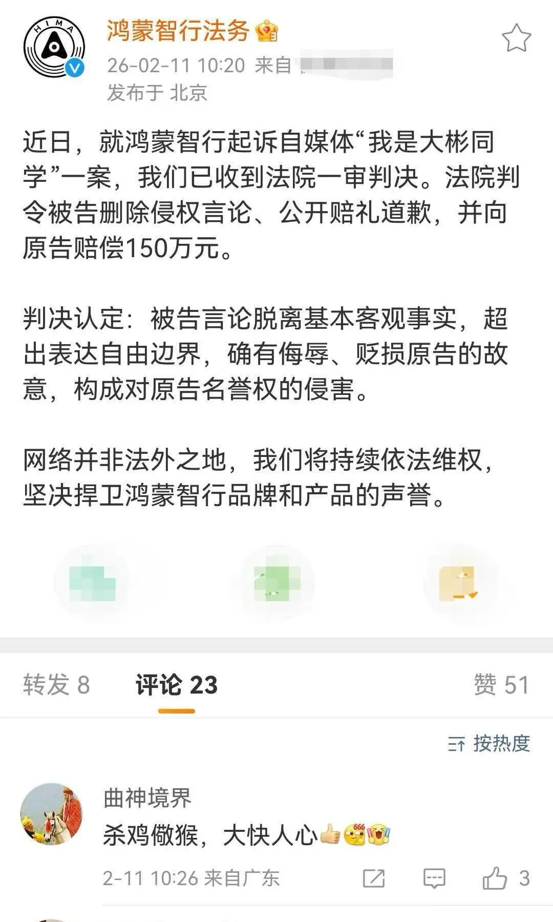 鸿蒙智行起诉自媒体“我是大彬同学”名誉侵权一案,法院一审已经宣判。