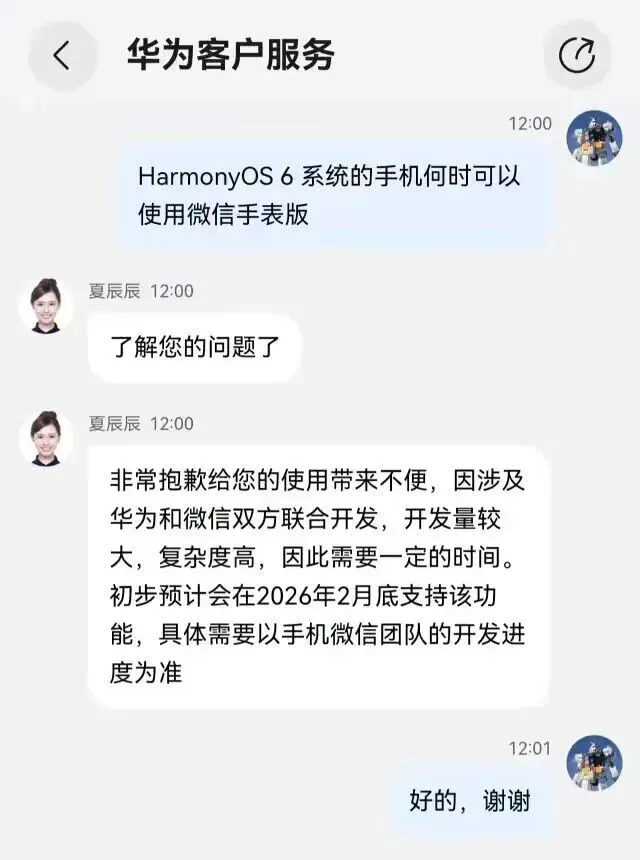 这事今天有了明确说法,我打电话问了华为客服,时间点在2月10日,得到的回复比较直白,鸿蒙6不是小修小补,系统底层换了一套,微信的手表端也不能照搬旧逻辑,双方一起把接口重写,把功耗重新算,把通信协议一条条对上去,后台保活以前一个做法,现在一个做法,要做到消息能秒到,手表电量又能顶住,权衡点在中间,开发工作量肉眼可见地大,节拍慢一些就慢一些,稳定第一。