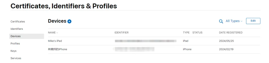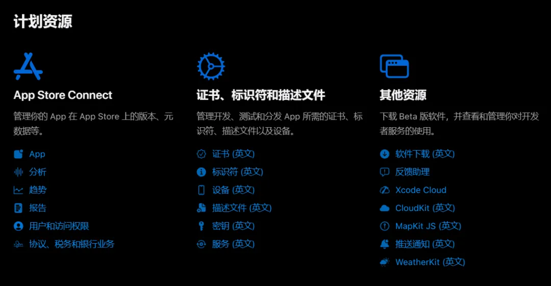 如果我们已经完成开发,目标直指上架 App Store,那么我们最需要关注的几个模块就是App、证书 Certificates、标识符 Identifiers 和描述文件 Profiles。