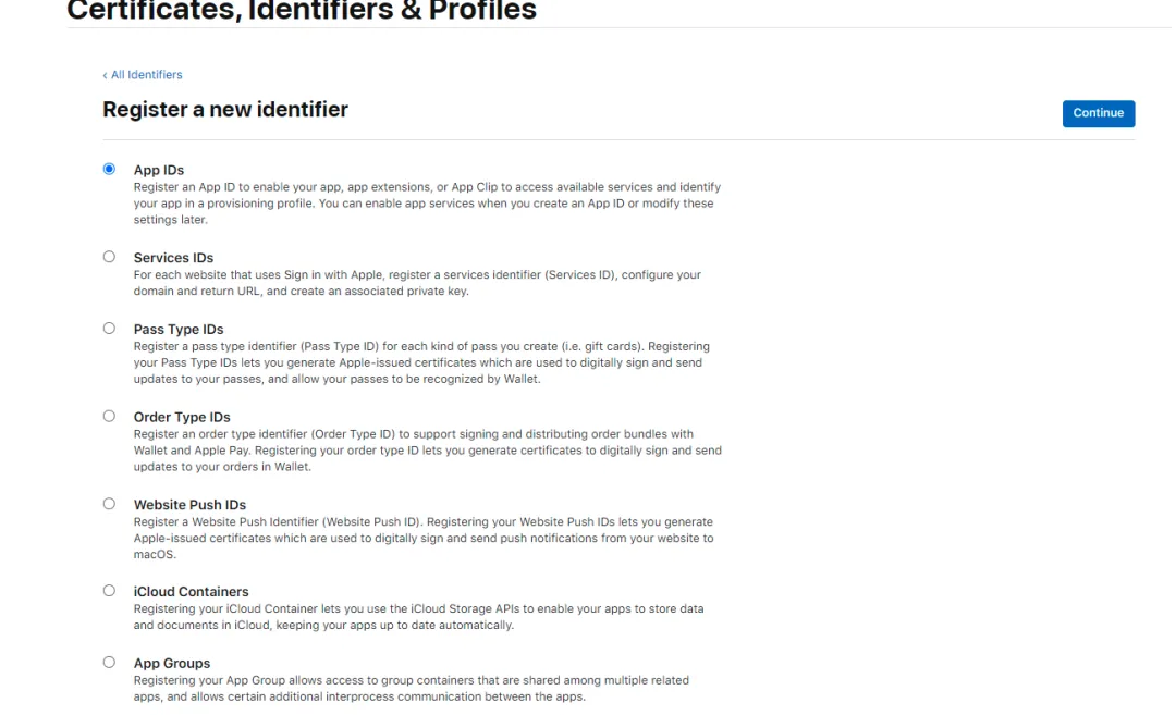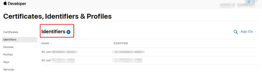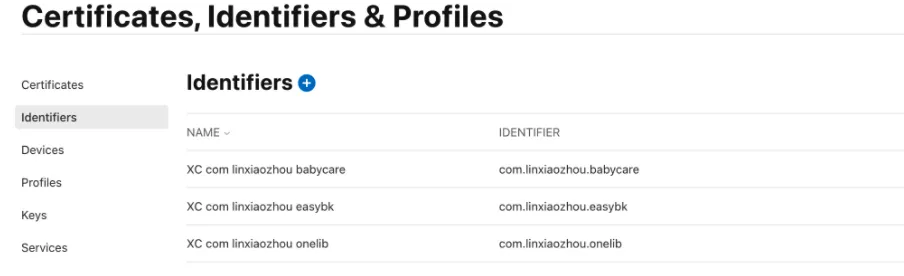当你需要创建一个新的app时,就需要去申请一个新的标识符 Identifiers。申请地址:https://developer.apple.com/account/resources/identifiers/list