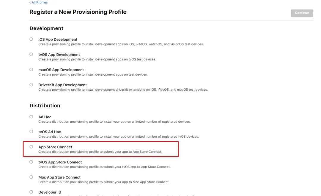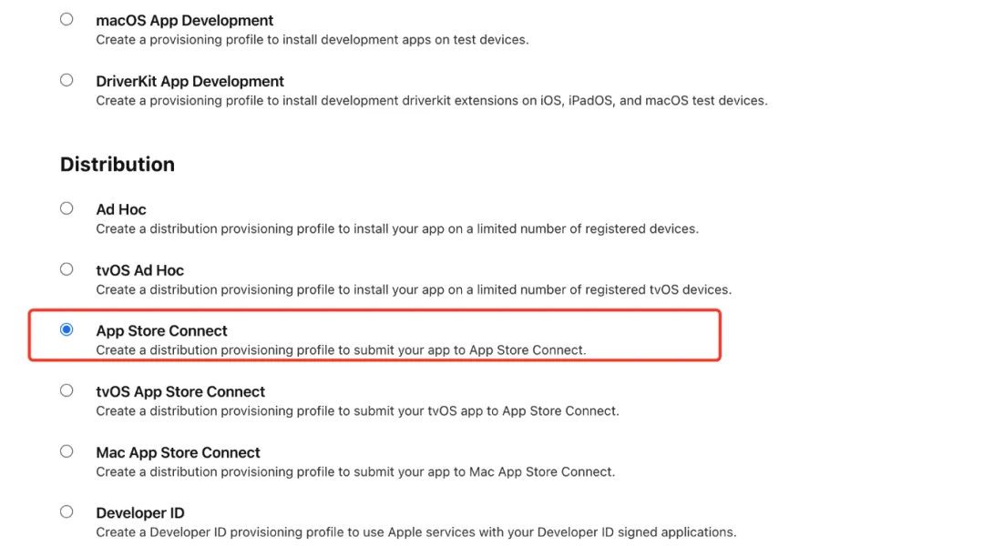 使用时要注意,如果想发布到 App Store,那么应该选择“App Store Connect”;但这个类型的 Profile 不能进行 Ad Hoc Distribute,如果要发布测试版本,需要选择“Ad Hoc”