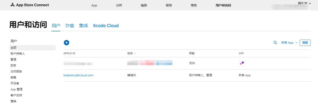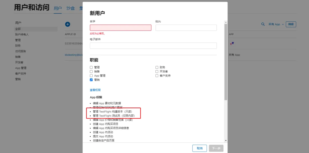 如果你想添加一个用户来测试我们的 App,可以选择“营销”的角色: