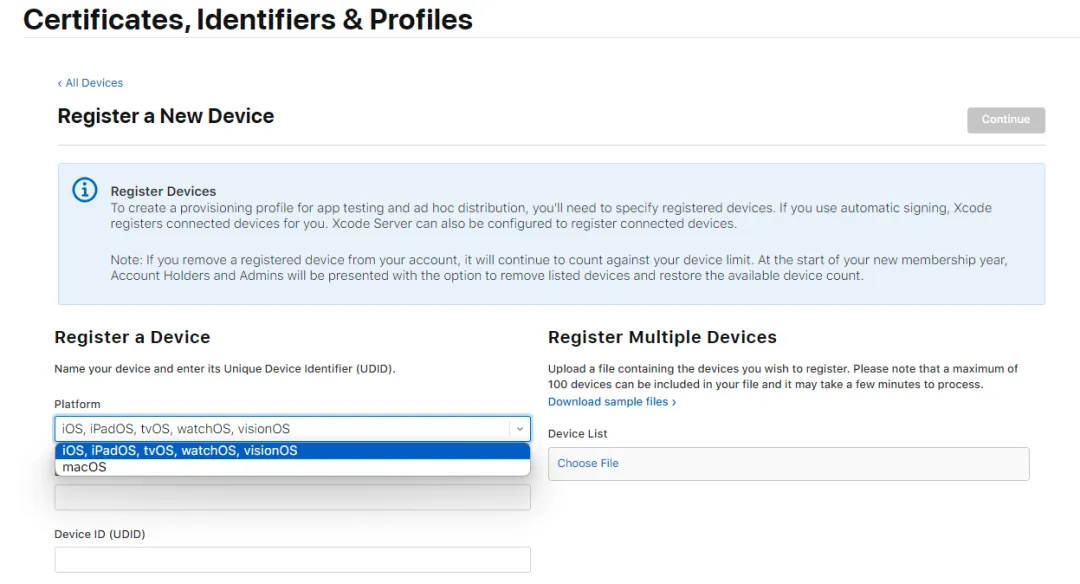 需要注意的是,如果你此前已经有“套装ID”,直接选择下拉框里的即可。如果没有,则需要先去“标识符”页面创建一个。地址为:https://developer.apple.com/account/resources/identifiers/list
