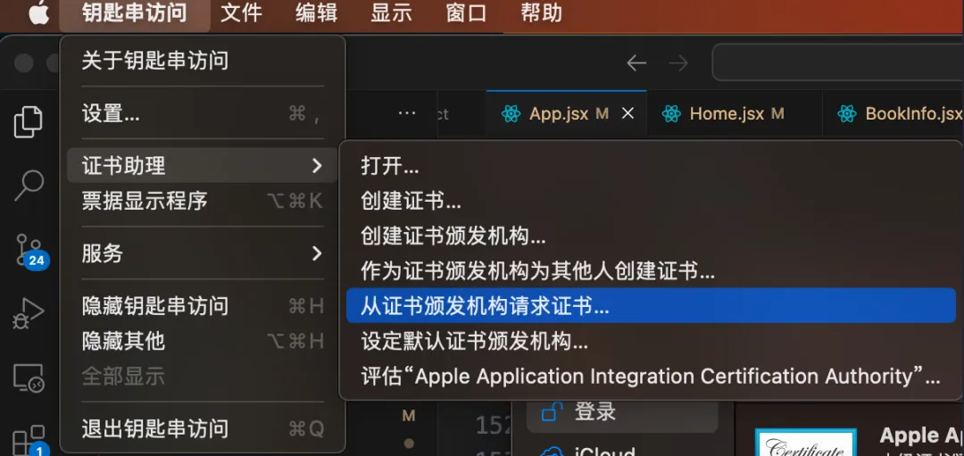 Cmd+空格键,搜索“钥匙串访问”。点击顶部工具栏“钥匙串访问”,选择“证书助理” -> “从证书颁发机构请求证书”。