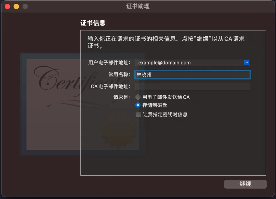 填写基本信息,CA 电子邮件地址”栏位留空,选择“存储到磁盘”,点击“继续”: