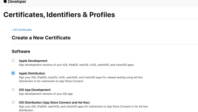 选择“Apple Distribution”或“iOS Distribution (App Store Connect and Ad Hoc)”: