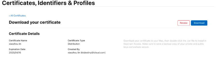 请先在 App Store Connect 中创建 Distribution 类型的证书,并确保此证书用于App签名,且它的证书有效期足够长,避免因为备案前后证书不一致造成不必要的麻烦。具体步骤详见下一章。