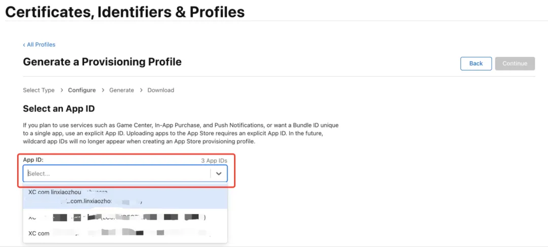选择一个 App ID(如果没有,需要先创建)后下一步: