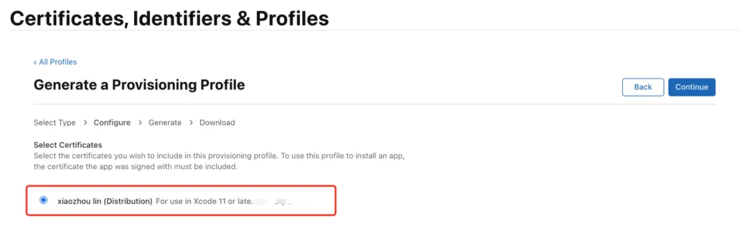 注意,应当填写用于正式分发的Distribution 证书信息,如果没有应当先创建一个: