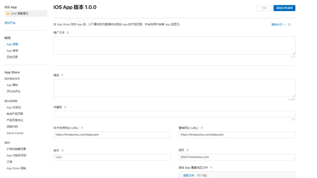 填写推广文本、描述、关键词等,提供技术支持和营销网址。你可以在这里修改 App 的版本号。