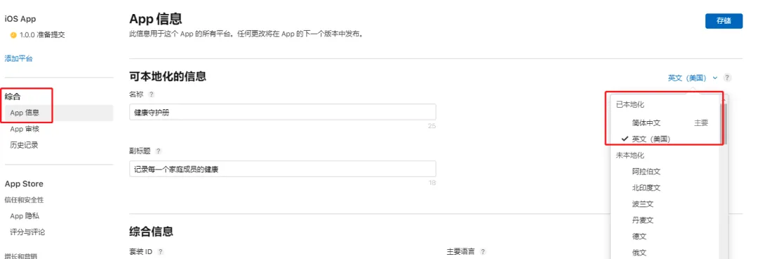 在“综合”->“App信息”里,可以填写不同的名称、副标题信息,方便推广到不同地区。