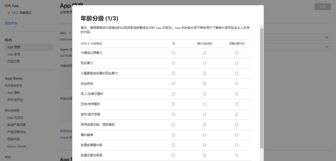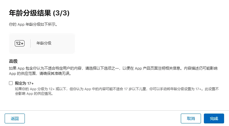 你需要填写年龄分级的内容,Apple 会根据你填写的内容给出该 App 的年龄分级。