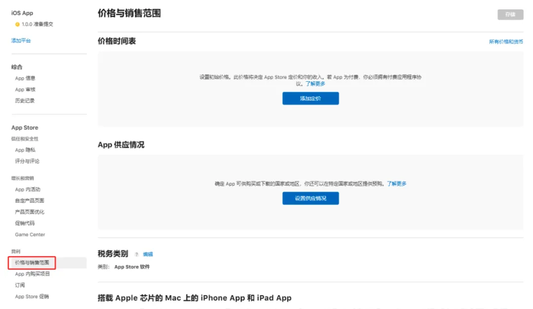 首次提交,需要你设置 App 的价格即销售范围。如果你需要 App 内购买或订阅,我会在后续文章里介绍如何填写相关内容,本文暂不介绍。
