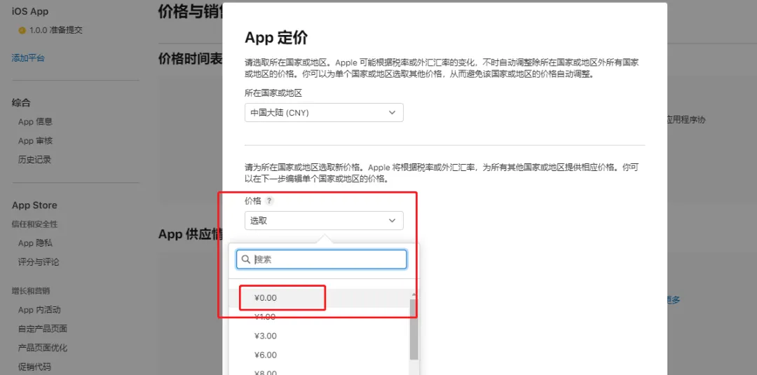 如果你的 App 免费(或采用 App 内购买或订阅模式),则设置价格为0即可。