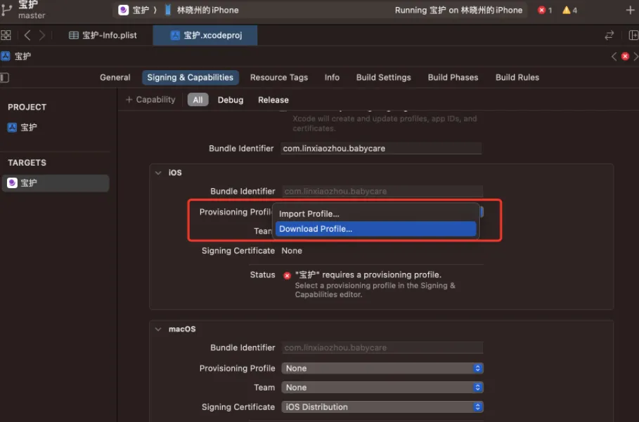 在 XCode 中选择“Signing&Capabilities”,在 Release 标签中的 iOS 中,选择下载 Profile: