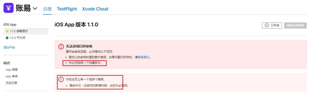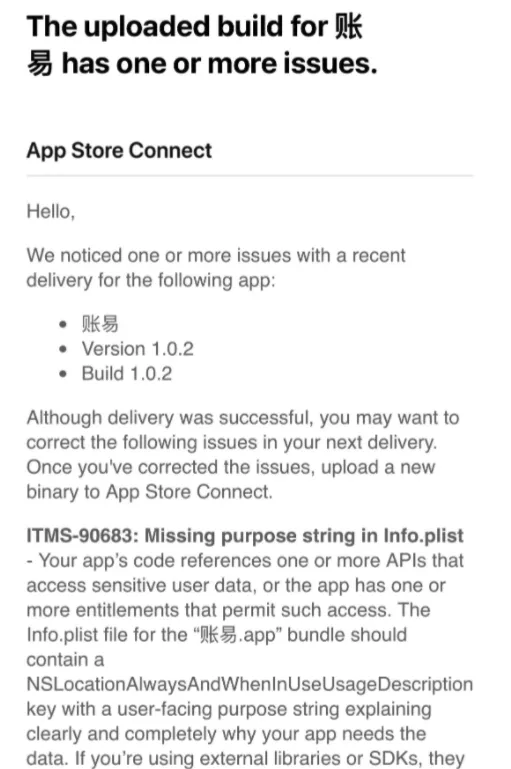 如果没有收到邮件提示成功或收到的邮件提示你上传的构建版本有一个或多个问题,那么你要先解决后才能在 App Store Connect 网页找到。例如下面就是一个案例,在上传后提示有几个问题: