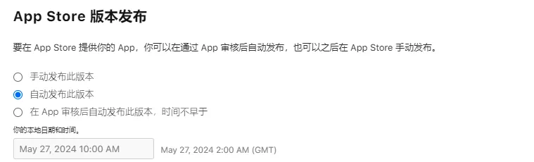 打开 App Store Connect 网页,在“构建版本”中选择要用于审核的版本,并选择版本发布的方式: