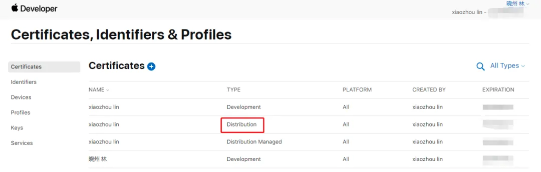 带 Distribution 的证书类型:用于分发测试或上架 App Store 的签名。简单来说,Development 类型的证书能做的,它都能做,想要上架、就需要用这类证书来签名。