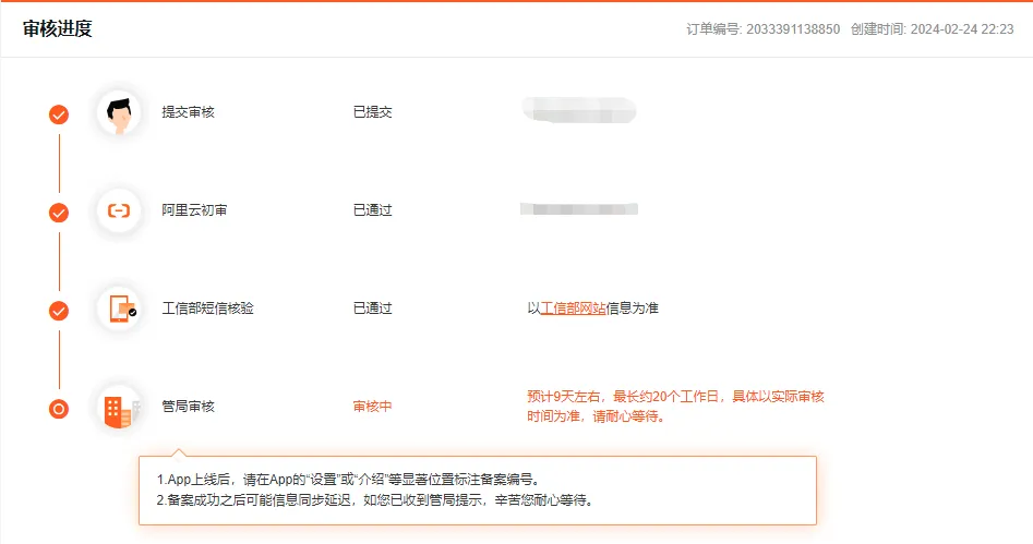 备案一个 App 的时间一般需要 9~20 天,首次备案可能相对慢一些。基本流程是: