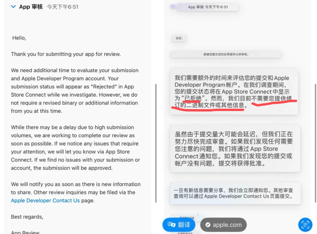 而我运气不好,刚好遇到周五,在整改完成重新提交后,已经赶不上本周的审核队列了、直接拖到了下周一(幸好没有其他问题,周一一大早就审核通过)。审核人员很贴心地把所有截屏都作为审核不通过的附加发给我了。