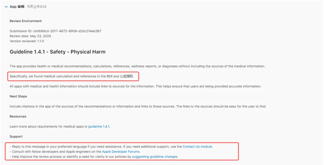 不要以为很简单的一些信息不算,比如 BMI、高血压的判断标准,它们都属于应当提供信息源的内容。(Apple 在审核的时候还很贴心地截屏给我圈出来)