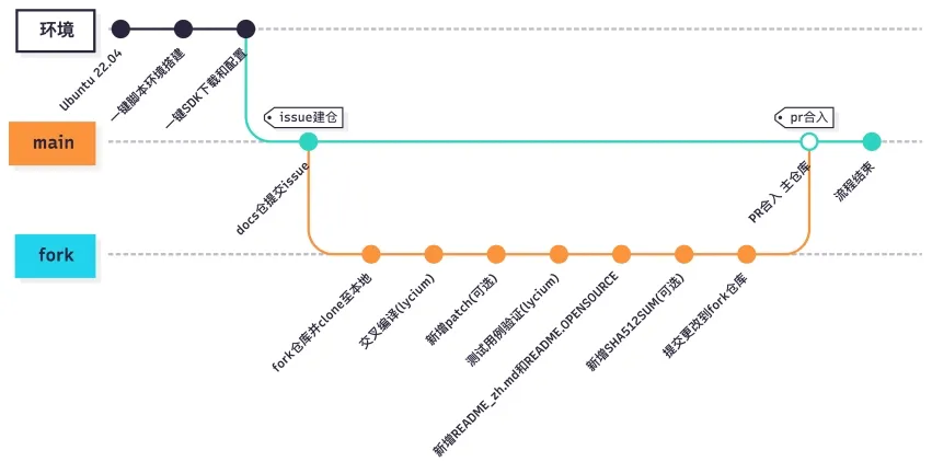值得一提的是,基于官方提供的基础文档,我们已完成了全流程的实操验证与经验沉淀,系统整理出包含环境搭建、成果验证、代码贡献等关键环节的详细实操指南。在该章节介绍了如何搭建交叉编译环境以及快速完成目标库交叉编译,在该章节介绍了如何使用目标库测试用例来测试目标库鸿蒙化适配的完整性,本章节主要聚焦于完整的贡献流程。